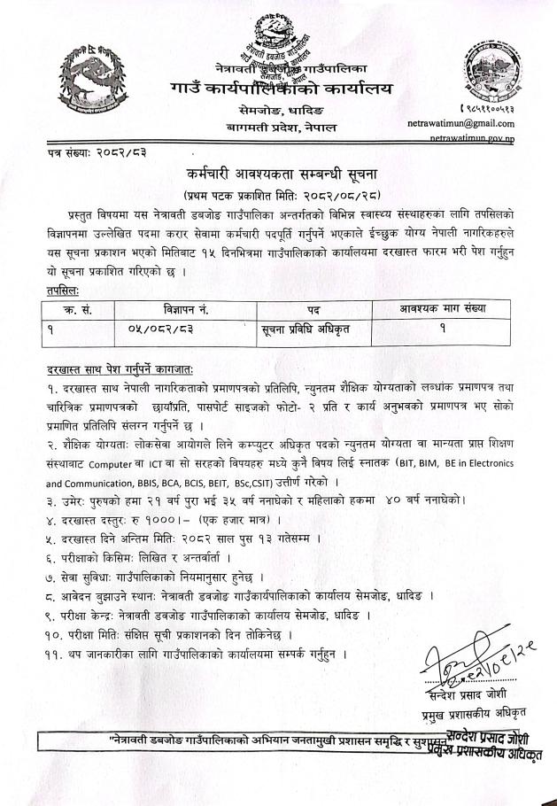 कर्मचारी आवश्यकता सम्बन्धी सूचना ।