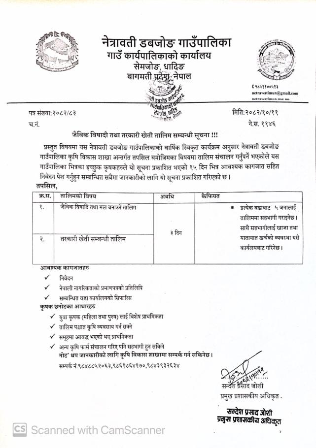 जैविक विषादी तथा तरकारी खेती तालिम सम्बन्धी सुचना