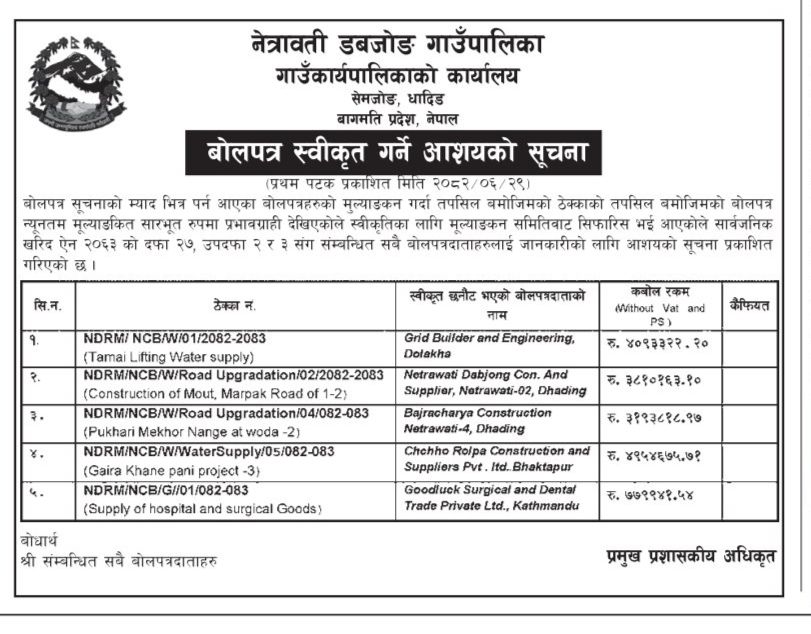 बोलपत्र स्वीकृत गर्ने आशयको सूचना !!!
