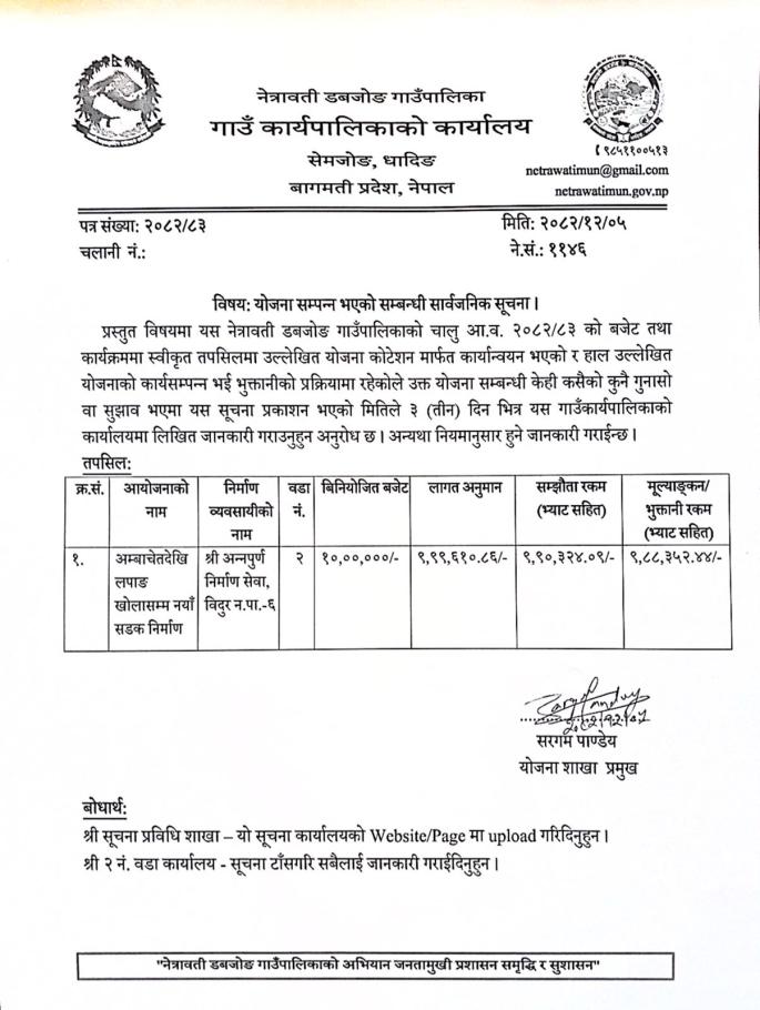 योजना सम्पन्न भएको सम्बन्धी सार्बजनिक सूचना