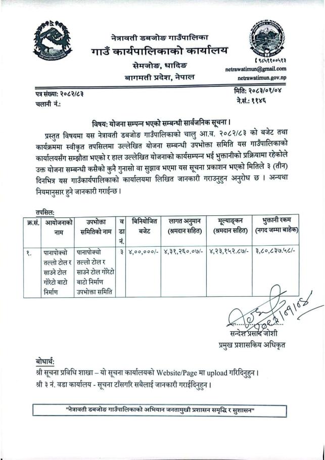 योजना सम्पन्न भएको सम्बन्धी सार्वजनिक सूचना