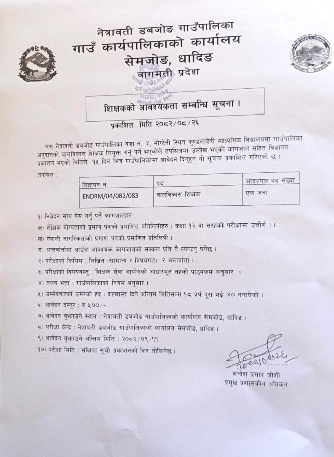 शिक्षकको आवश्यकता सम्बन्धि सूचना ।