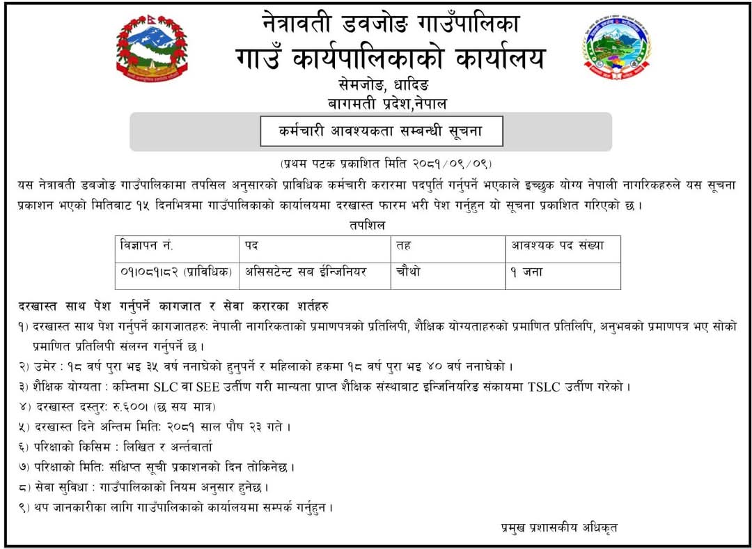 कर्मचारी आवश्यकता सम्बन्धी सूचना !!!