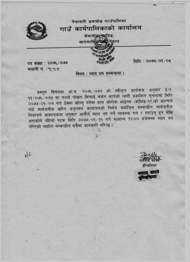 तल्लाे पाेखरा सिँचाइ मर्मत कार्यकाे म्याद थप सम्बन्धमा ।