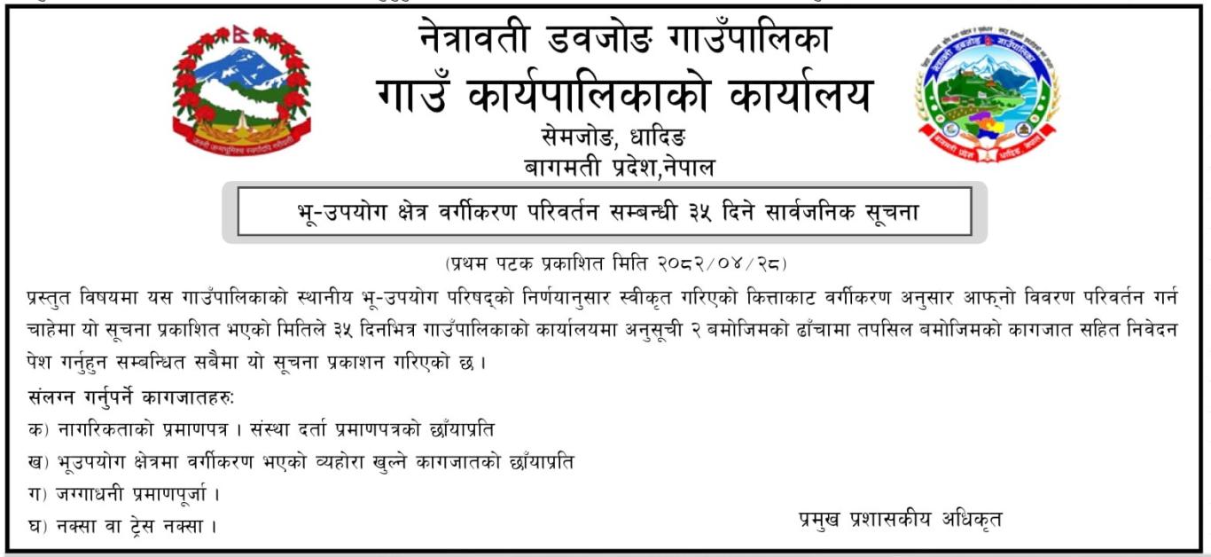 भू-उपयोग क्षेत्र वर्गीकरण परिवर्तन सम्बन्धी ३५ दिने सार्वजनिक सूचना !!!