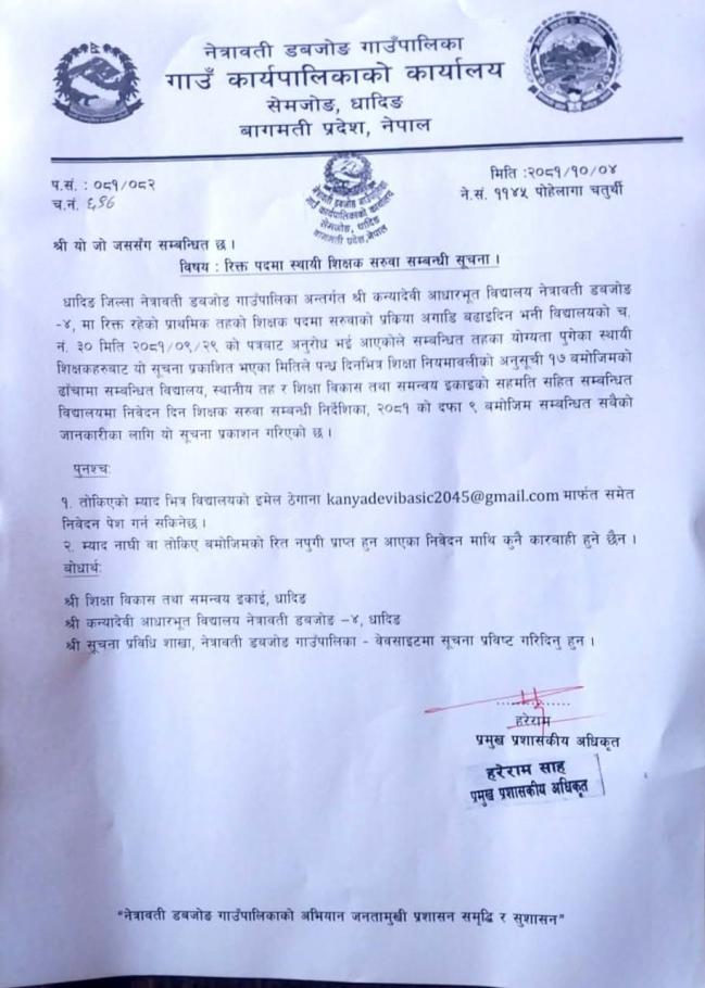 रिक्त्त पदमा स्थायी शिक्षक सरुवा सम्बन्धी सूचना !!!