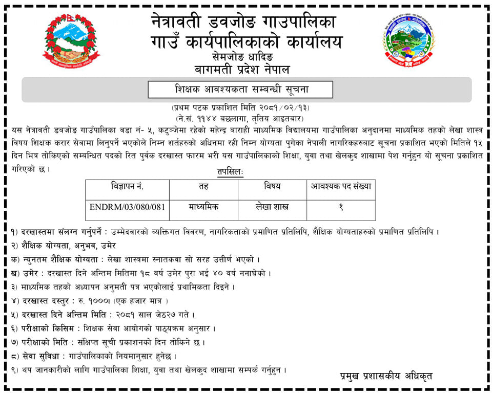 शिक्षक आवश्यकता सम्बन्धी सूचना !!!
