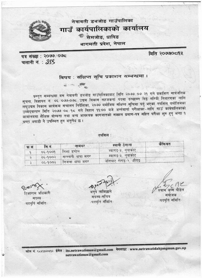 संक्षिप्त सूचि प्रकाशन तथा परीक्षामा उपस्थित हुने सम्बन्धी सूचना ।