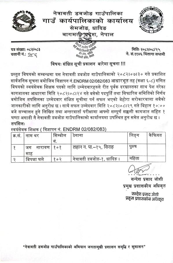 संक्षिप्त सूची प्रकाशन बारेमा सूचना ।